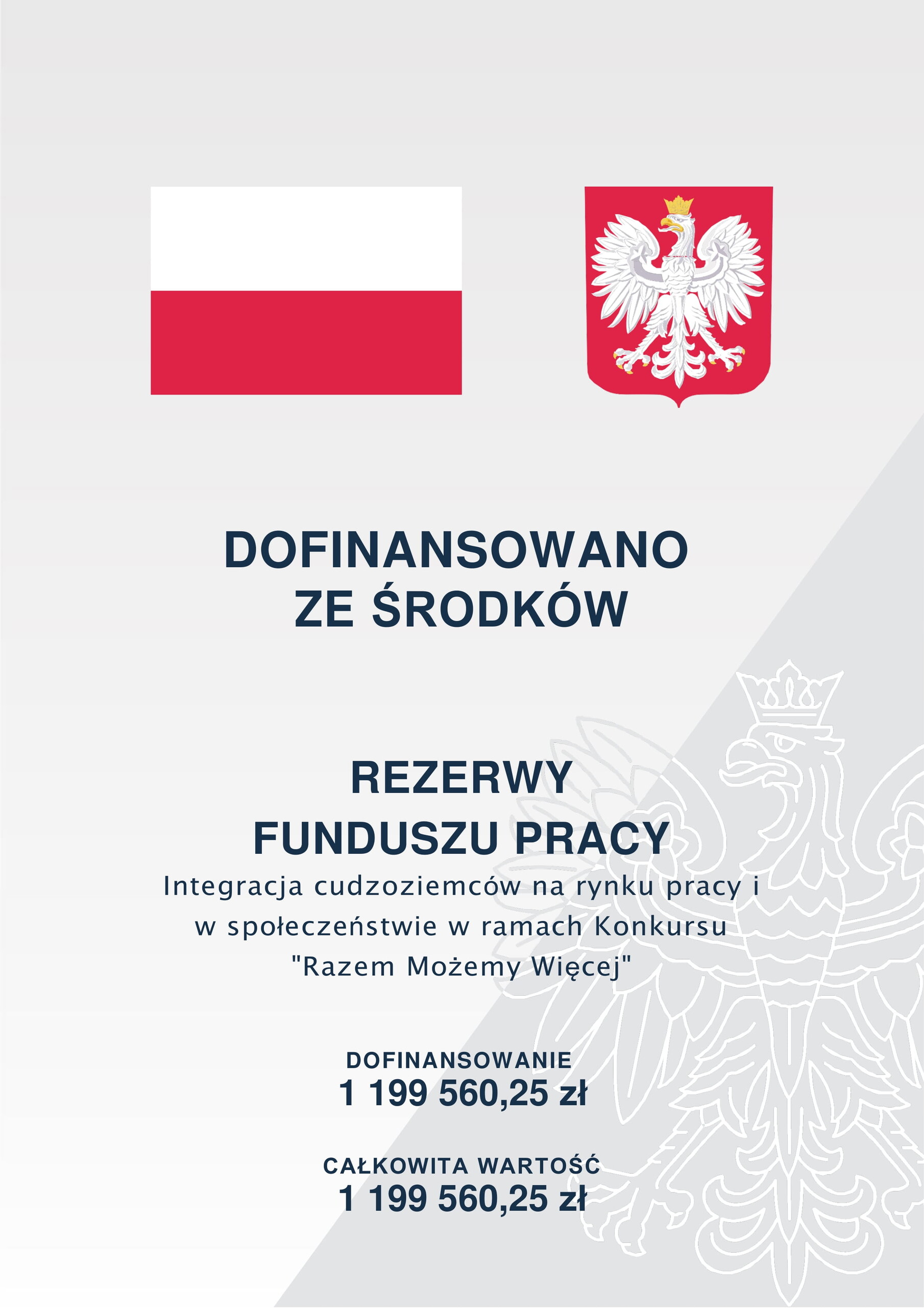Projekt Pracuj w Polsce finansowany z Funduszu Pracy realizowany jest w ramach programu pn. „Razem Możemy Więcej – Pierwsza Edycja Programu Aktywizacyjnego dla Cudzoziemców na lata 2022–2023” - w ramach Resortowego Programu Aktywizacyjnego dla Cudzoziemców na lata 2022–2025.